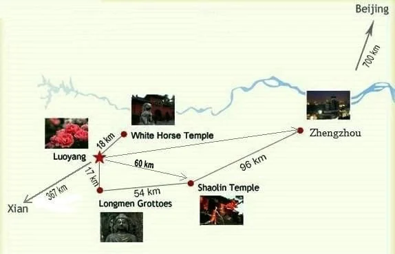 - Luoyang – Longmen Grottoes, 17km, 30 minutes drive.