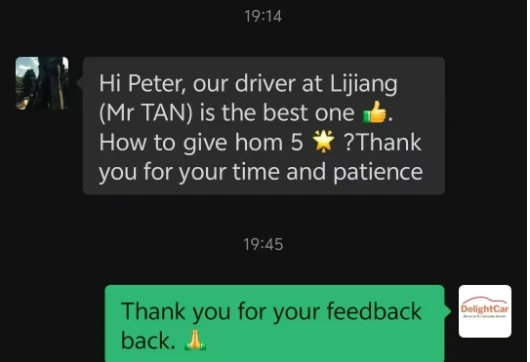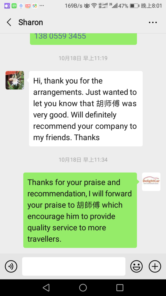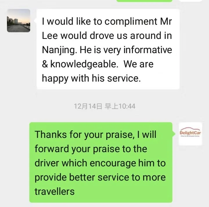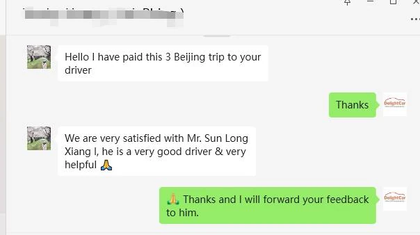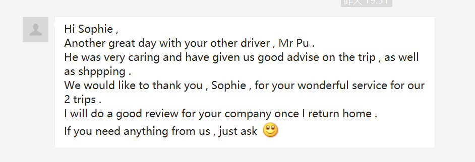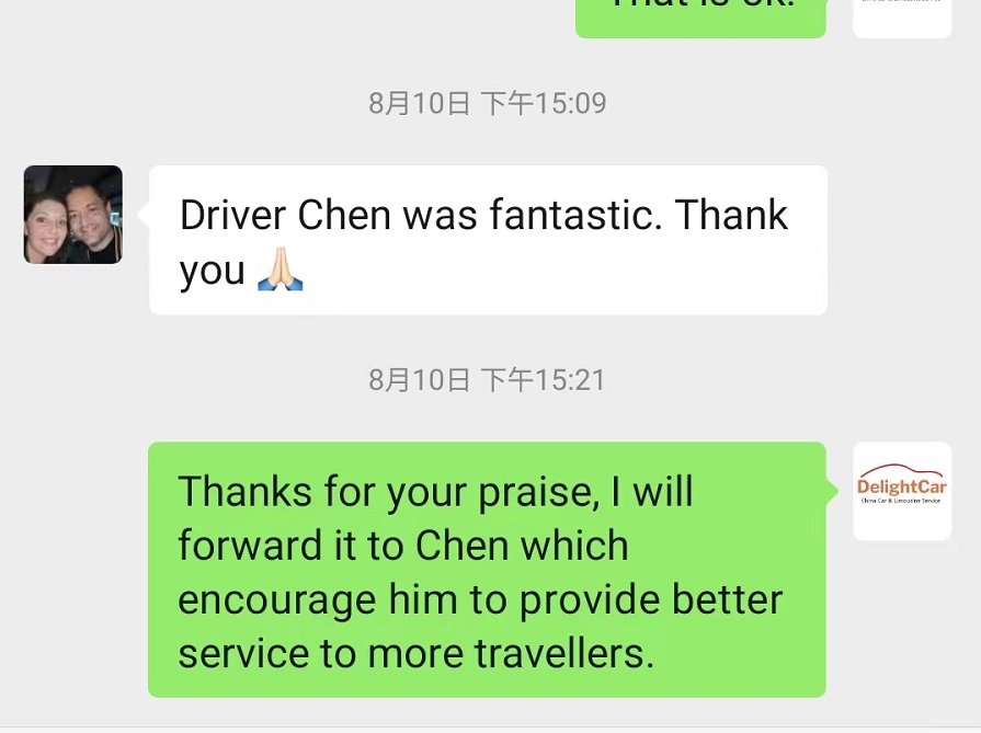 I would like to compliment your driver, Ms Wang (in Xi'an) and Mr Huang (in Luoyang), both of them are very professional, nice, friendly, and kind to my family. Even though they can't communicate in English but they took very good care of my elderly family members. I'm very impressed! Thank you for providing such an excellent service 🙂