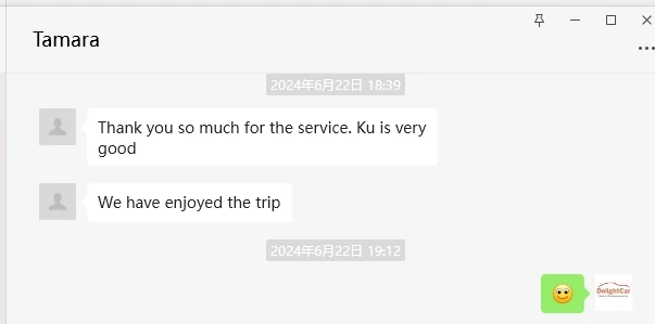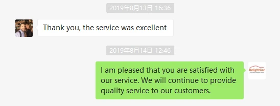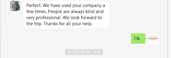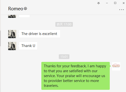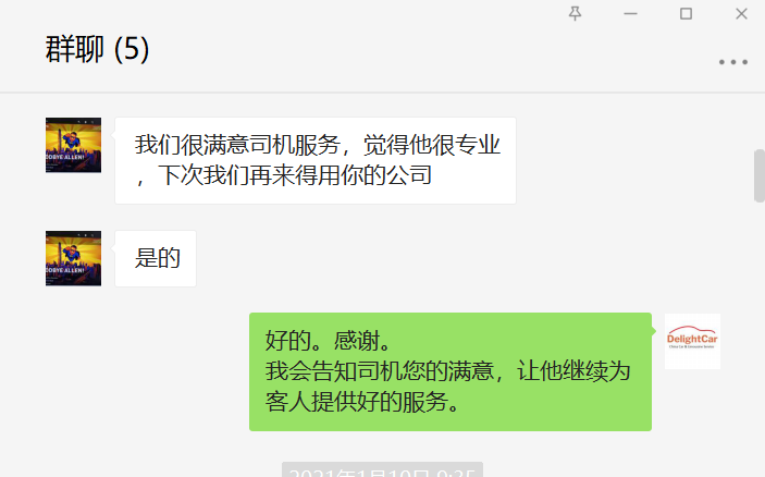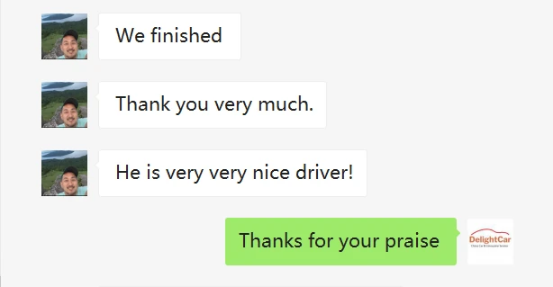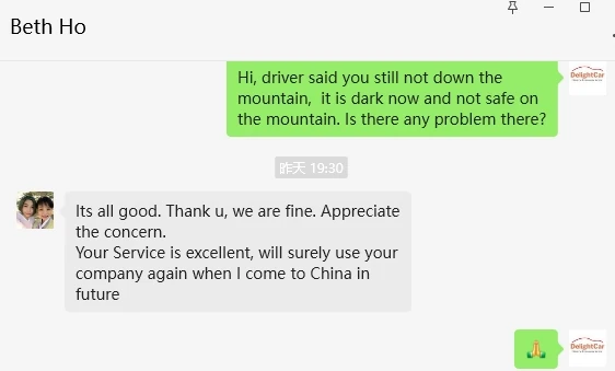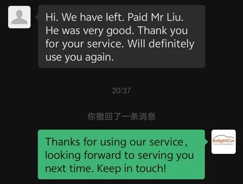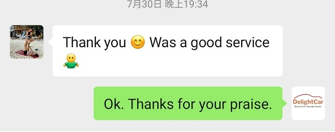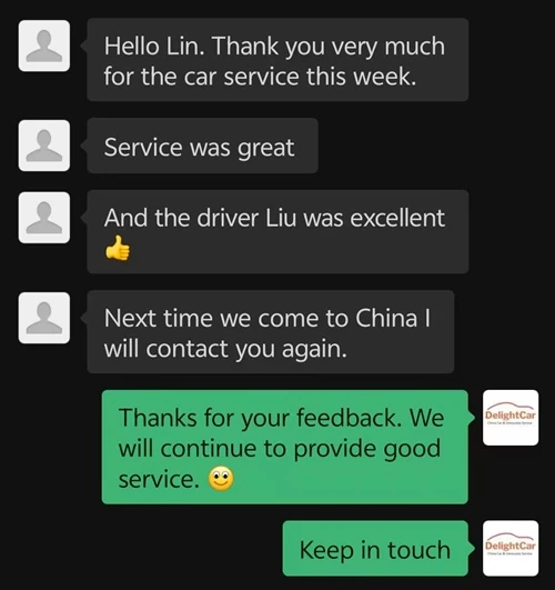 Sorry this email is so late but I wanted to let you know that we were very impressed with the car and driver for our day in Shanghai. We will certainly use Delight Cars again if we return to China.