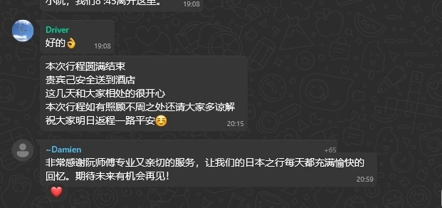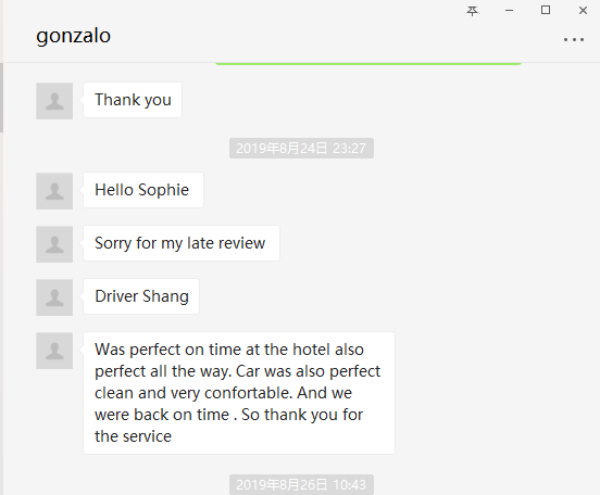We want to say thank you. Our trip was wonderful. Very good service. Congratulations. Wang is a good and kind driver