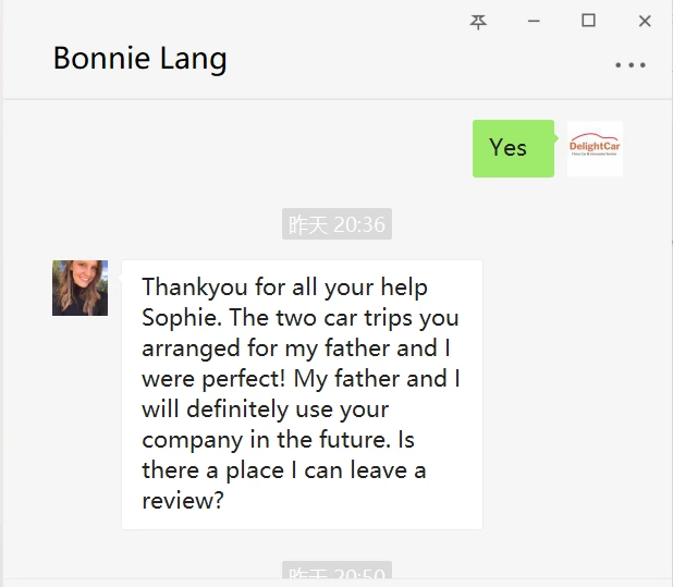 I did not have time to send a review earlier, so I wanted to tell you that we were very satisfied with the service: the car was clean and comfortable, and Mr Yan was driving carefully. Most of all, I would like to commend the attitude of Mr Yan, who was very attentive to our needs and made every effort to communicate with us in English. I know that Mr Yan would like to improve his English, and I think that any help he may get to do this would certainly be a good investment for the business.