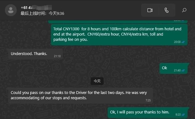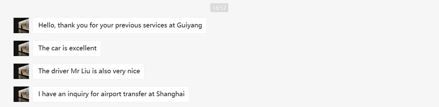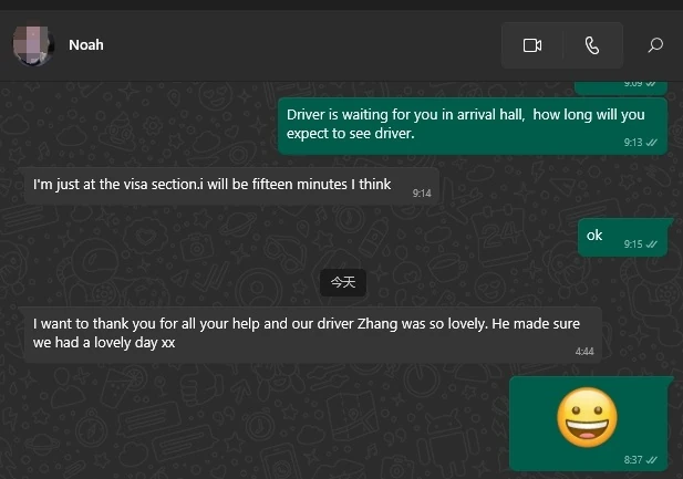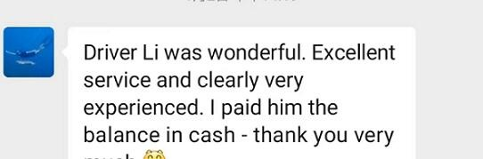 Thanks very much to your drivers. They are all very understanding, at least when I tell them I will Alipay you later, they trust me. Thank you. You also didn’t charge me extra for the bigger vehicle to help us get to the airport.
