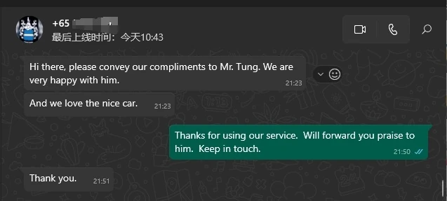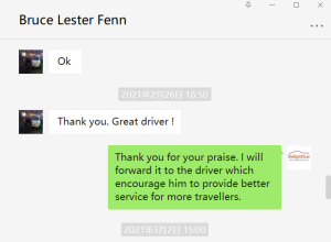 Thanks Mr Wang. Mr Lei is a very good driver. We are very happy with your service. Will not hesitate to recommend you to my friends