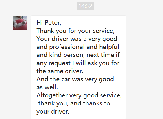 Hello Peter, thank you for this message, but we are already in Vietnam. I just want to tell you that the car was much better and more comfortable than we expected, the roads were also fantastic, and the driver was excellent and also a very nice guy. The only minor aspect was the problem with communication in English, but Mr. Liu tried very hard with his phone to translate. Like I said, a very nice guy! Anyway, if somebody asks me about Guangzhou, I will certainly recommend your service, because it was perfect, THANK you,