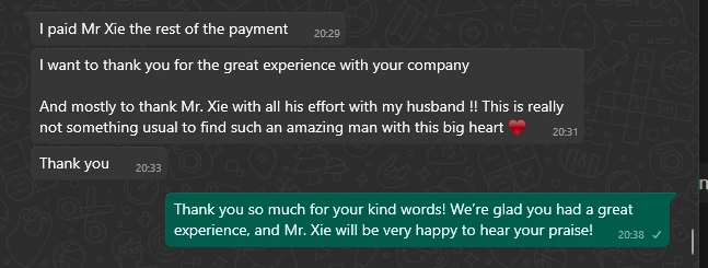 It’s been a pleasure dealing with you, and I will certainly recommend you to my friends when they travel to China.