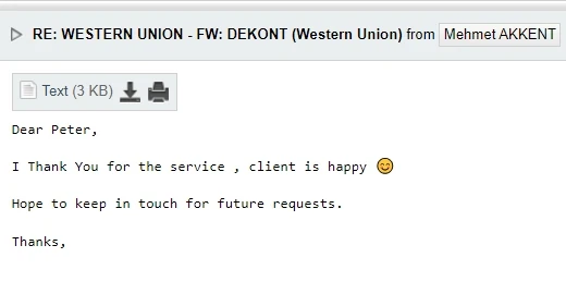 I would like to thank you for the transfer last week because it went perfectly.